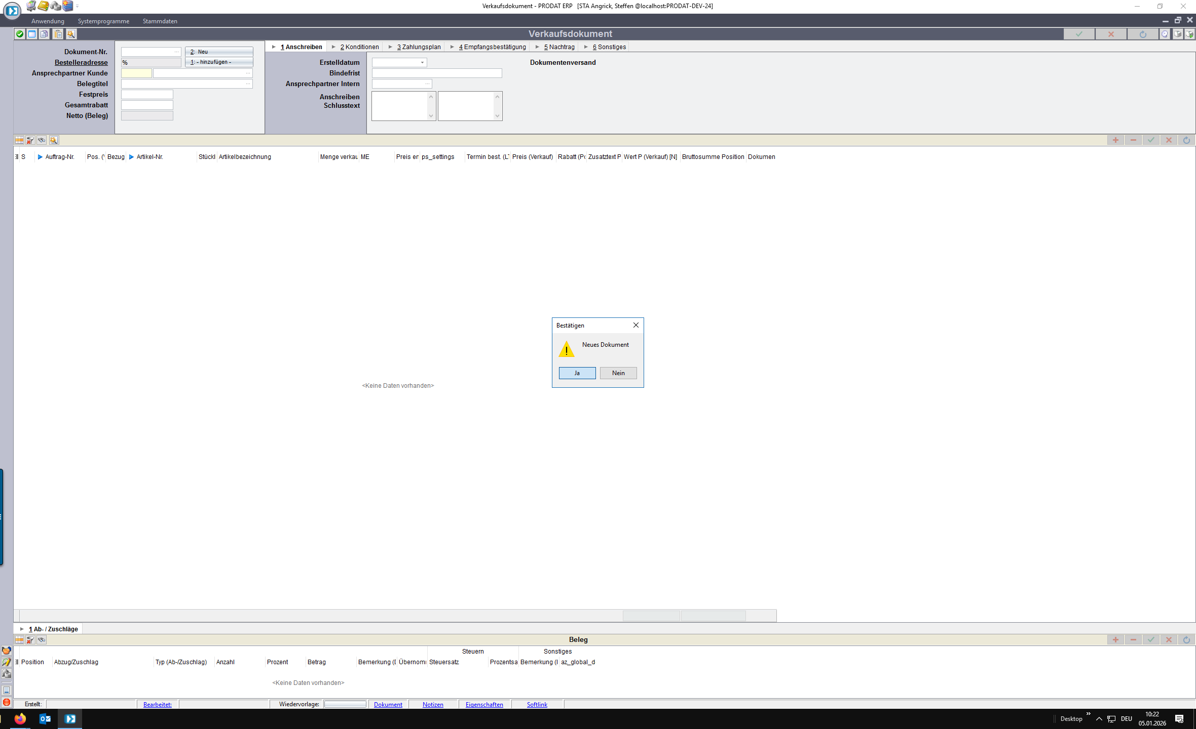 Klick auf „Nein“ Button, wenn keine weiteren Positionen dem Angebot ergänzt werden sollen.
